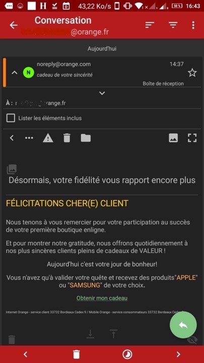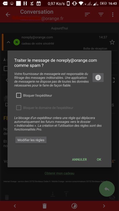 On peut évidemment déplacer un message vers les spams, ou bloquer un expéditeur,