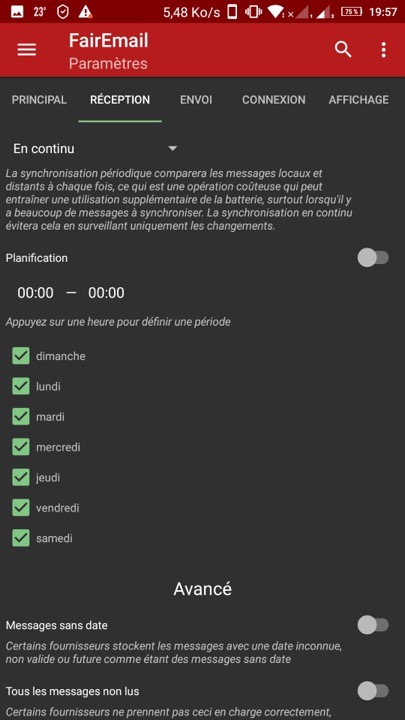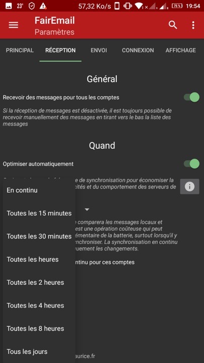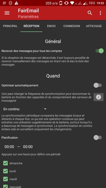 sélectionner les options et les horaires de réception pour chacun des comptes.
