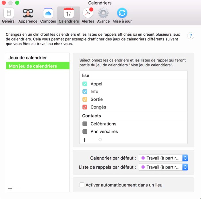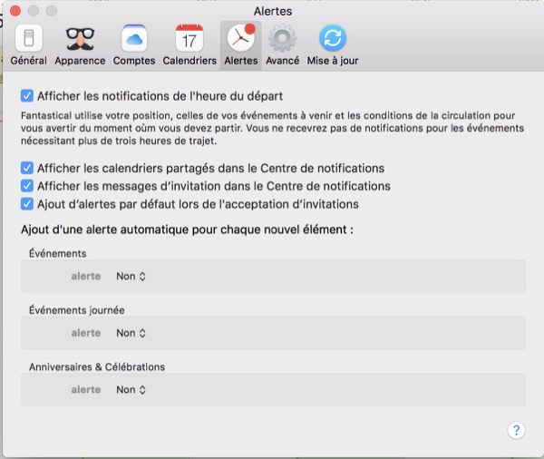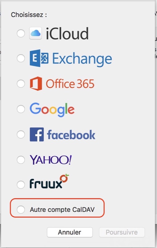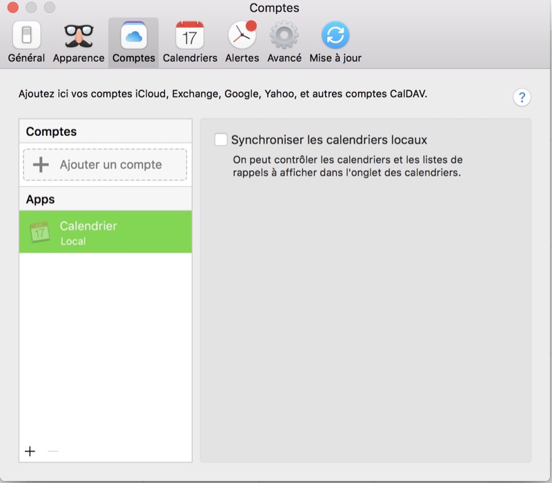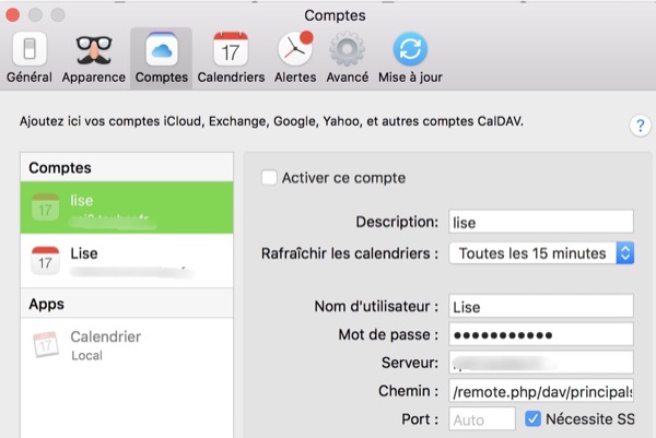 Lorsque j’ai installé Fantastical sur mes Macs, j’ai choisi de synchroniser l’application directement avec notre serveur ownCloud sans passer par les applications par défaut Calendrier et Rappels.