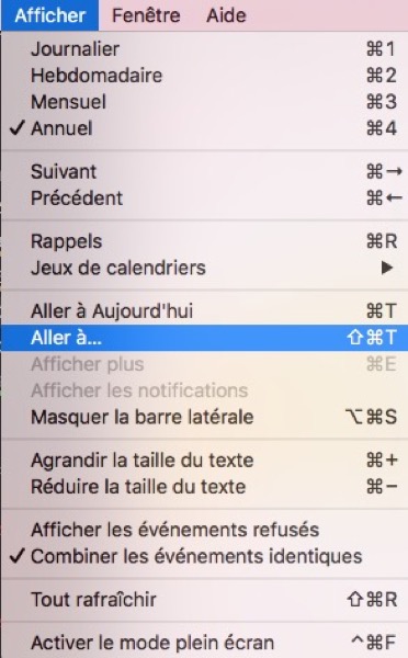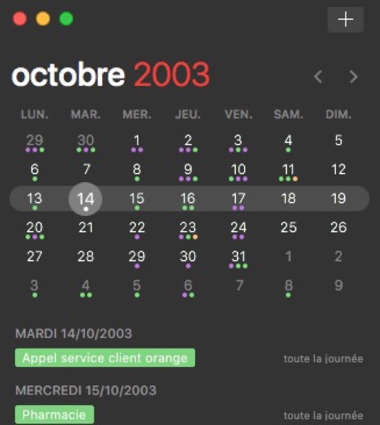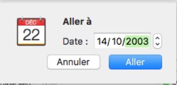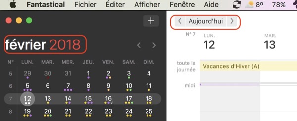 On peut accéder à une date particulière depuis le menu. Pour revenir à Aujourd’hui, comme sur l’iPhone, on clique sur le nom du mois dans la barre latérale, ou tout simplement sur Aujourd’hui depuis la vue quotidienne, hebdomadaire, mensuelle ou annuelle.