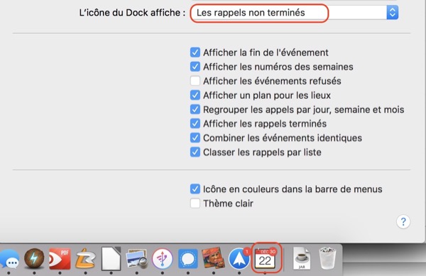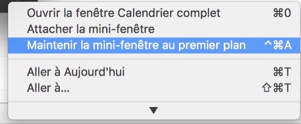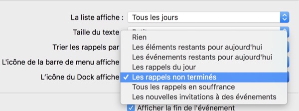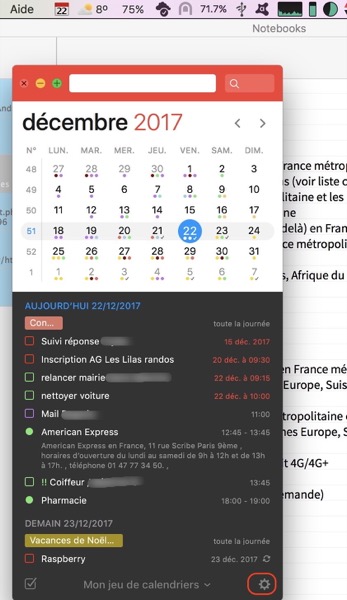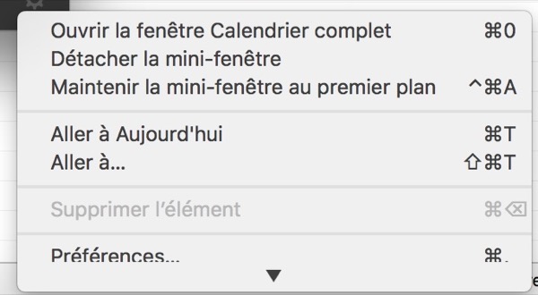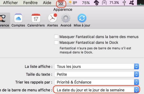 Une des caractéristiques de Fantastical est l’accès à une mini fenêtre depuis la barre de menu. Cette mini fenêtre reprend en fait la vue de la version iPhone ! Les options de cette mini fenêtre sont accessibles depuis la petite roue en bas en droite. La mini fenêtre peut être détachée ou pas de la barre de menu, et la barre de menu afficher des informations différentes de l’icône du Dock : la date, le jour, le mois, les rappels du jour, les rappels terminés…