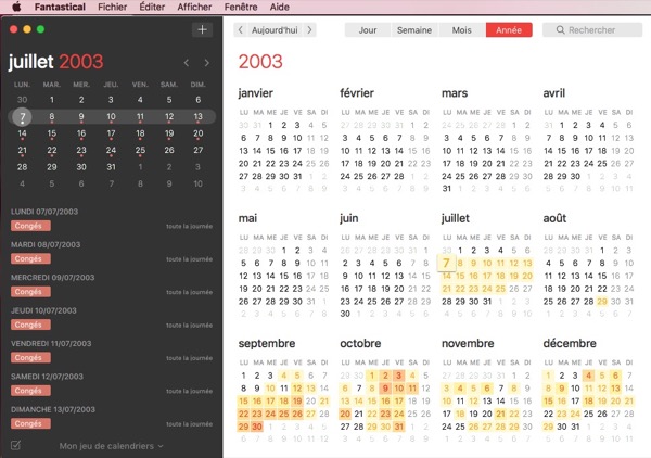 Fantastical propose sur le Mac une interface plus classique, avec vue quotidienne, hebdomadaire, mensuelle et annuelle. La liste sur la gauche de l’écran et la mini fenêtre reprennent l’interface de l’iPhone.