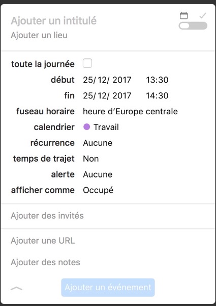 Pour ajouter un événement, on peut soit cliquer sur le + dans la barre latérale gauche (image 1), soit effectuer un clic droit dans l’application (image 2). Dans la fenêtre de saisie, on peut basculer de la création d’un événement (image 3) à celle d’une tâche (image 4).