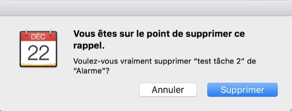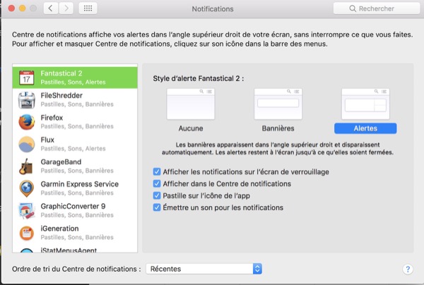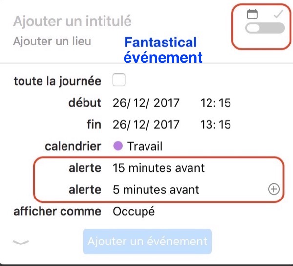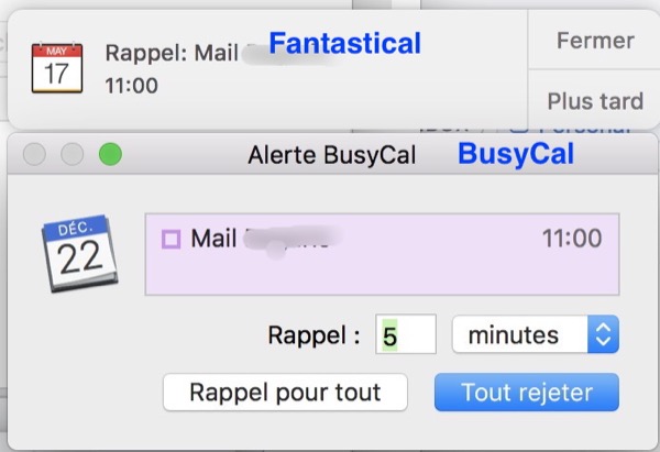 Fantastical gère bien sûr les notifications. Je préfère pour ma part les options proposées par BusyCal : des alertes qui peuvent s’afficher en dehors du centre de notification, qu’on peut supprimer individuellement ou pas, et qui permettent depuis l’écran de notification de cocher une tâche terminée. En outre, on peut définir plusieurs alertes pour une tâche, ce qu’on ne peut pas faire avec Fantastical.