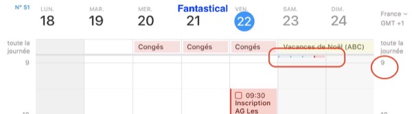 En revanche, si Fantastical présente les rappels à la fois dans la barre latérale et dans la vue hebdomadaire ou quotidienne, dans ces dernières, les tâches à la journée sont affichées à O h, contrairement à BusyCal qui permet de les visualiser quelle que soit l’heure…
