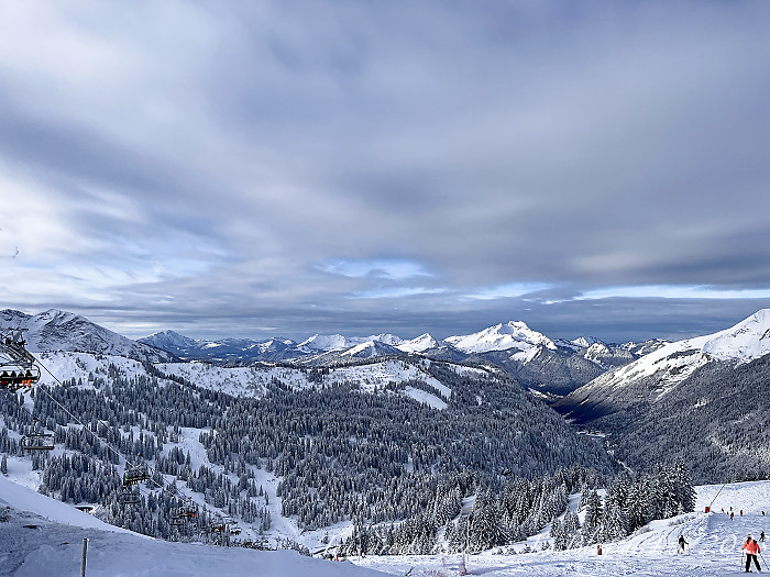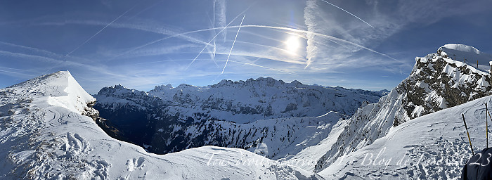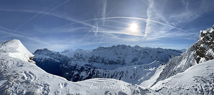 Du haut du télésiège du Fornet, à 2 210 m, à une altitude un tout petit peu inférieure à celle de la Pointe de Mossette (2 277 m), nous avions une belle vue sur les Dents du Midi (à gauche) et les Dents Blanches au centre.