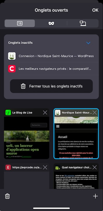 Les onglets que l’on n’a pas consultés depuis un moment sont rangés dans les Onglets inactifs et conservés pendant deux semaines, ce que l’on peut désactiver dans les paramètres. Pour y accéder, cliquez sur l’icône des onglets (image 1).
