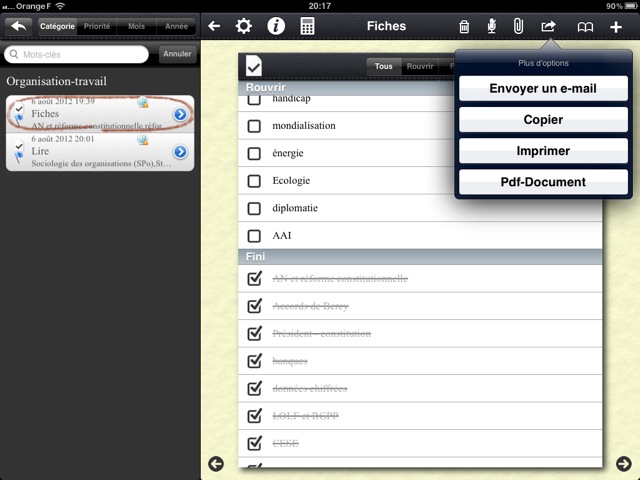 Les différents projets peuvent être envoyés par mail. On peut également créer des documents PDF et les ouvrir dans une application compatible. Les documents peuvent être classés dans différentes catégories.