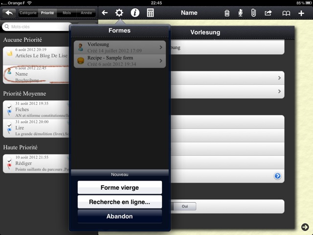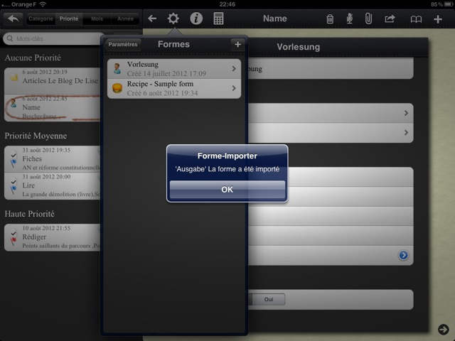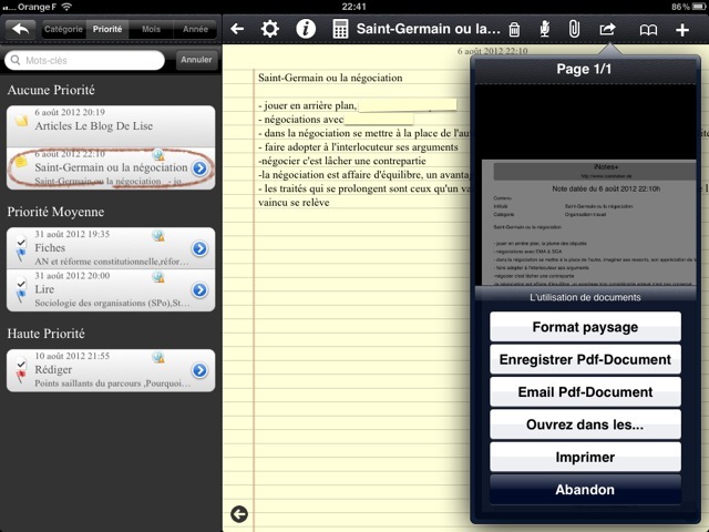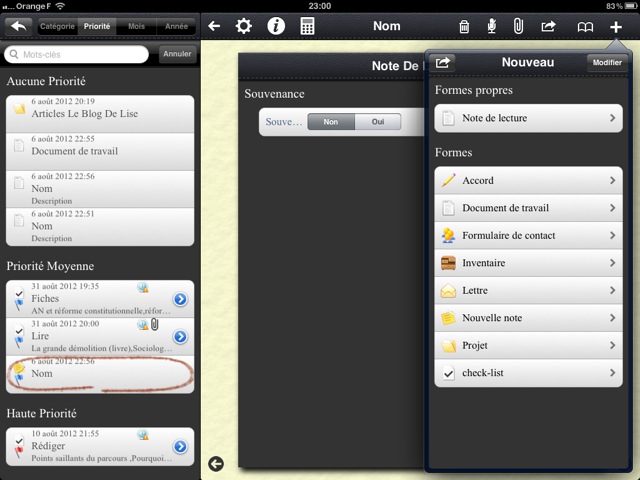 iNotes+ est compatible iPhone et iPad et est commercialisée au prix de 4,99 €. Elle propose différents formulaires, (on peut en créer d’autres soi-même), permettant de rédiger des notes, des rapports, des courriers signés, des formulaires de contacts, des contrats, de gérer des projets, des listes de tâches…
