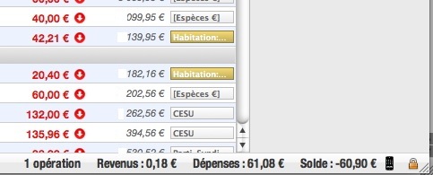 Pour synchroniser son iPhone/iPad avec le Mac, il faut cliquer en bas à droite de l’écran du Mac sur l’icône représentant un iPhone. Il faut bien sûr que le Mac et l’iPhone/iPad soit connecté au même réseau. Mes comptes étant déjà saisis sur le Mac, j’ai ainsi récupéré sur l’iPad et sur l’iPhone l’ensemble de mes écritures. Il est possible de purger les écritures anciennes.