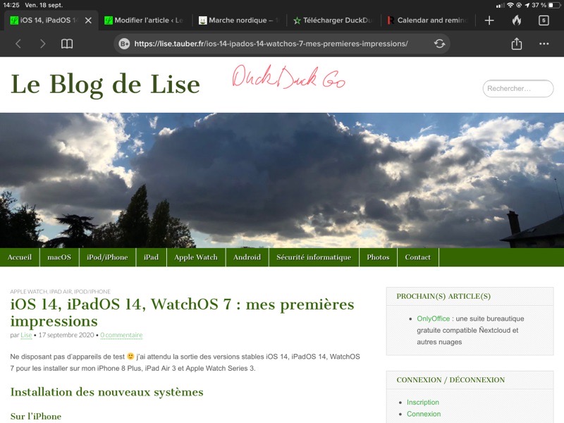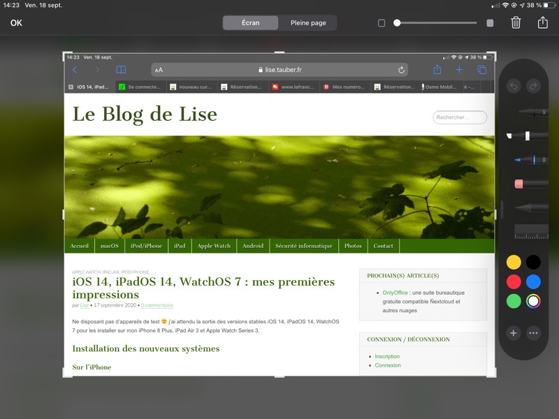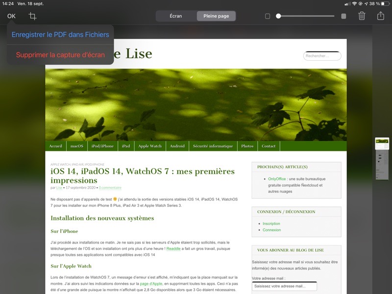 On dispose des mêmes options sur l’iPad. La seule grosse différence que j’ai notée avec Safari est l’impossibilité de réaliser une capture d’écran de toute une page web, que l’on peut ensuite enregistrer sous forme de fichier PDF.