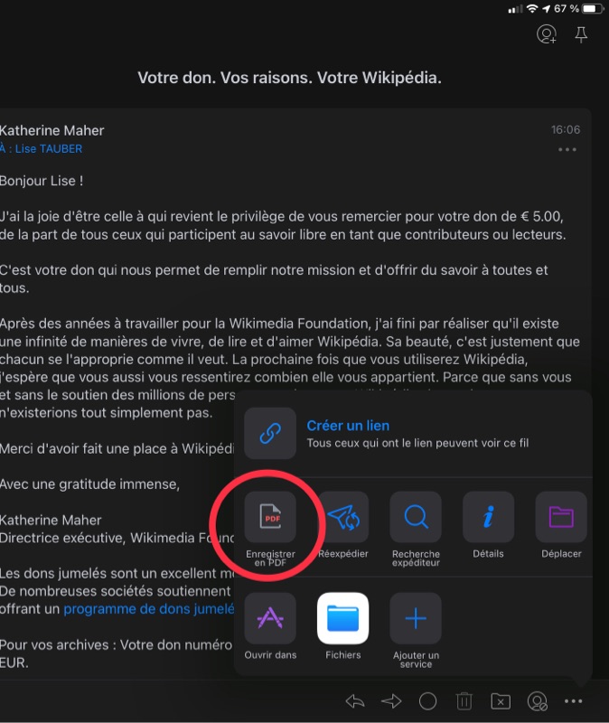 Il peut être utile d’archiver un message. Avec Spark, le client de messagerie que j’utilise, un tap sur … puis sur Fichiers (image 1) permet de choisir l’emplacement de sauvegarde au format texte (image 2) . On peut alors renommer le fichier et sélectionner son emplacement (image 3).