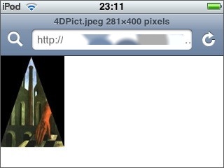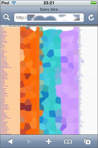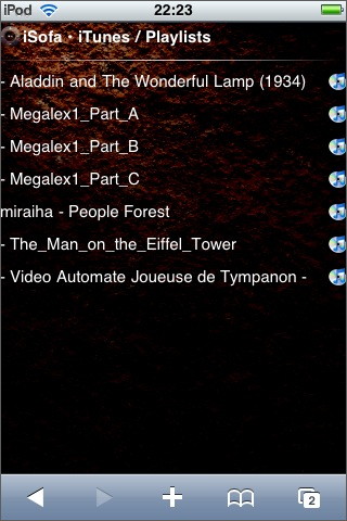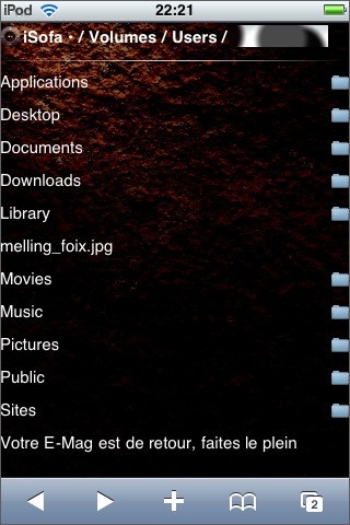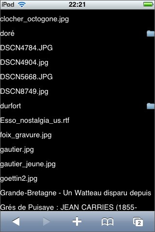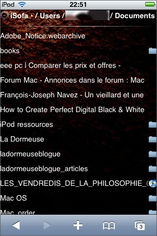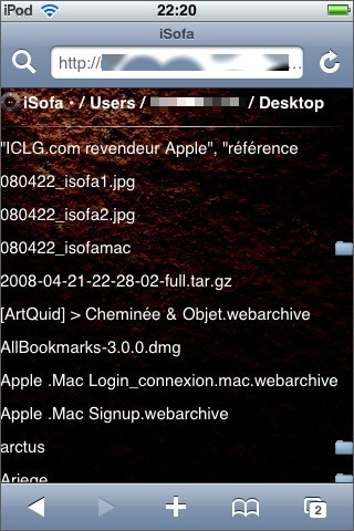 Si l’on clique sur l’icône « Browser » (la petite maison) de l’écran iSofa, on peut naviguer dans l’arborescence du Mac et ouvrir les fichiers .txt, .html, .doc, .xls, .jpg, .png, .gif, mais bizarrement pas les fichiers .pdf (que l’on n’a pourtant aucune peine à ouvrir sur le iPhone/iPod Touch via Apache).