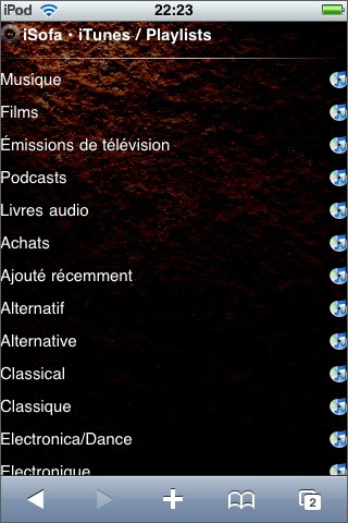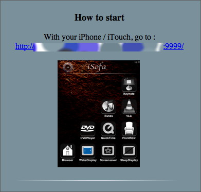 2. Après installation de iSofa sur le Mac, on entre sous Safari, sur le iPhone/iPod Touch, l’adresse IP du Mac (adresse fournie sur la page d’administration de iSofa), suivie de :9999/ et l’on établit la connexion désirée. On obtient l’écran ci-contre.