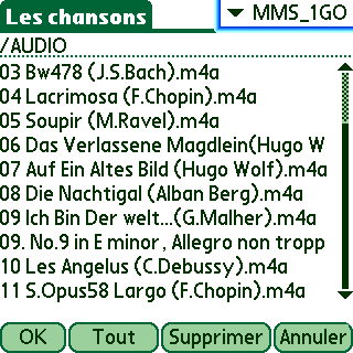 Avec iTunes, je les ai convertis en AAC, puis synchronisés avec The MissingSync. On peut tout aussi bien synchroniser des listes que des listes intelligentes. Les fichiers peuvent être installés en mémoire ou sur la carte d’extension du Palm (ils sont alors placés automatiquement dans le répertoire Audio).