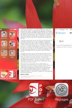 L’accès aux applications en arrière-plan se fait soit par un double appui sur le bouton central, soit sur l’iPad, par un glisser du bas vers le haut avec quatre doigts.