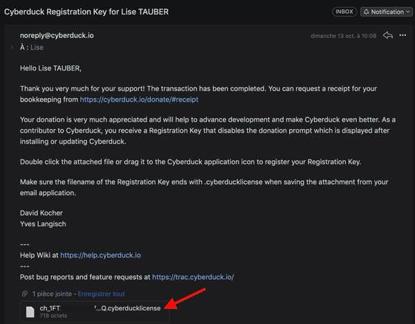 Le côté positif de Cyberduck, c’est qu’on peut utiliser l’application gratuitement. On peut également l’acheter sur le Mac AppStore (26,99 €), ou contribuer à la hauteur de son choix depuis le site du développeur. On reçoit alors, quelle que soit la façon dont on s’est acquis d’une contribution, une licence. Il suffit de double-cliquer sur le fichier joint au mail pour s’enregistrer.