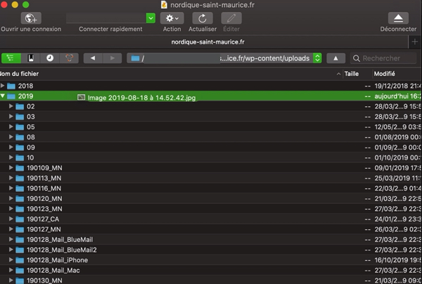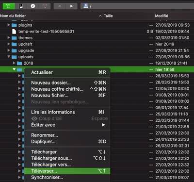 L’affichage des répertoires et fichiers n’offrant qu’une arborescence sous forme de liste, le plus rapide est de double-cliquer sur un répertoire pour afficher son contenu. Pour téléverser un fichier dans un répertoire, le plus simple est de ne pas ouvrir ce dernier et de glisser simplement le fichier vers le dossier.