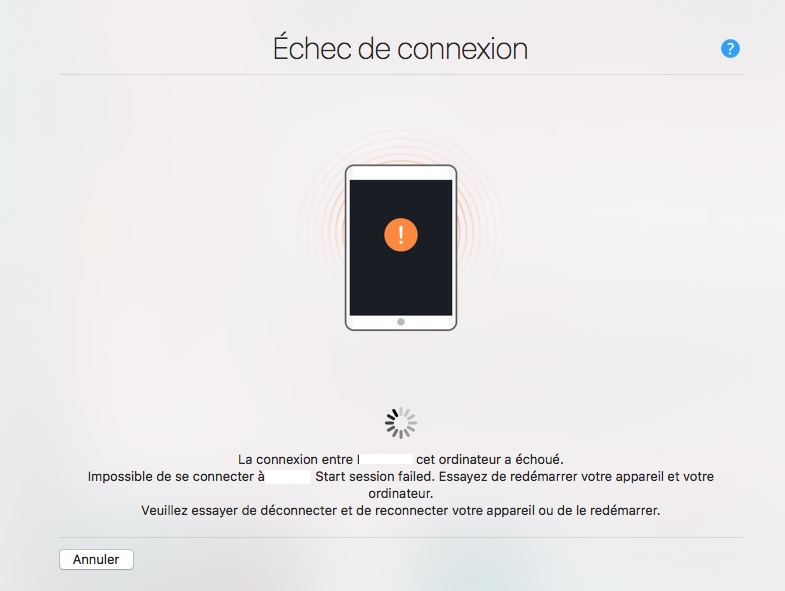 Lorsque l’iPad (ou l’iPhone) est en cours de restauration, forcément, iMazing ne peut s’y connecter et affiche un message d’erreur. Mais pas d’inquiétude, la restauration continue… Pour ma part, elle est restée bloquée à la moitié du chemin… J’ai alors fermé puis relancé iMazing, et le processus a repris son cours…