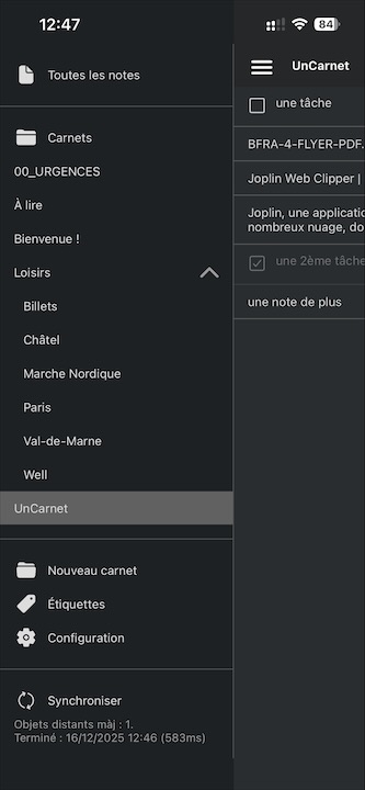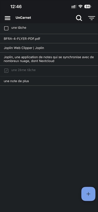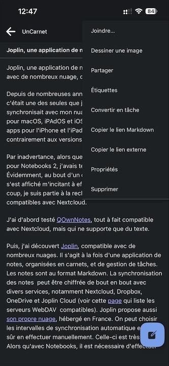 Puis, j’ai découvert Joplin, compatible avec de nombreux nuages. Il s’agit à la fois d’une application de notes, organisées en carnets, et de gestion de tâches. Les notes sont au format Markdown. La synchronisation des notes peut être chiffrée de bout en bout avec divers services, notamment Nextcloud, Dropbox, OneDrive et Joplin Cloud (voir cette page qui liste les serveurs WebDAV  compatibles). Joplin propose aussi son propre nuage, hébergé en France. On peut choisir les intervalles de synchronisation automatique et, bien sûr, en effectuer manuellement. Celle-ci est quasi instantanée, il faut juste attendre quelques secondes pour la synchro des images. Alors qu’avec Notebooks, il est nécessaire d’effectuer la synchronisation manuellement avec chaque appareil, et celle-ci est bien plus lente !