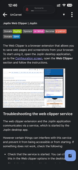 On peut aussi copier et coller des images directement dans l’éditeur de notes. Dès que l’appli est lancée, sur l’importe quel appareil, ordinateur, téléphone, tablette, la synchro s’effectue automatiquement ; du coup, Joplin est une véritable alternative à l’appli Note d’Apple, sans avoir besoin d’utiliser iCloud ! Et elle est très fluide, bien plus que Notebooks !