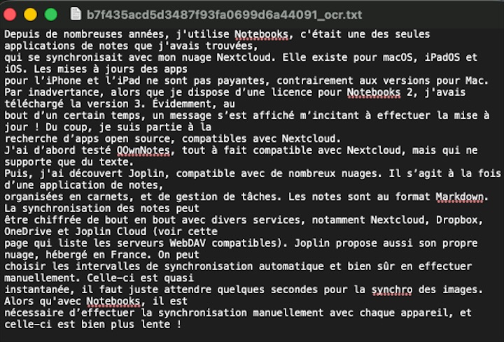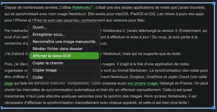 L’appli dispose également d’une fonction OCR, que j’ai testée rapidement. Celle-ci n’est disponible que sur l’application de bureau, car il s’agit d’un processus assez gourmand en ressources. Elle est exploitable pour la numérisation de textes imprimés, en particulier les PDF, ou les images où le texte est clair, comme les captures d’écran. Les textes manuscrits ne sont pas reconnus pour le moment. Je n’ai pas testé toutes les possibilités dans ce domaine (voir la page Optical Character Recognition (OCR)).
