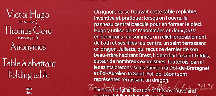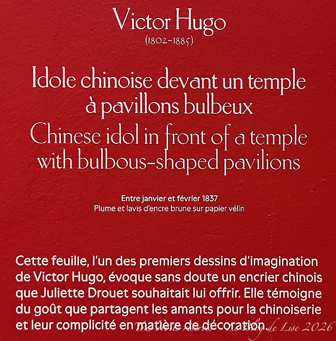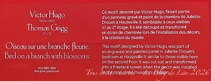 À la maison de Victor Hugo, place des Vosges, se tient une exposition Hugo décorateur. Celle-ci commence avec « des dessins de Victor Hugo où il met en scène ses propres décors ou bien reproduit des objets décoratifs », se poursuit par « des chinoiseries et des porcelaines, des bibelots […], les objets qu’il ne cessait d’acheter […], les panneaux gravés et peints […] pour Hauteville II, la maison de Juliette Drouet… »