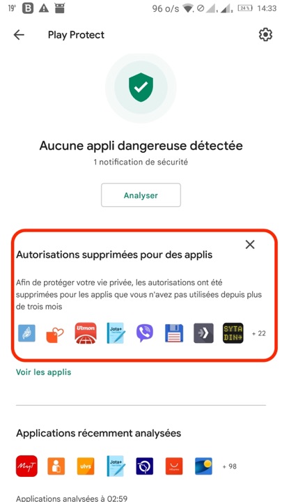 En fait il s’agit de la fonction Google Play Protect, activée par défaut, mais qui peut être désactivée. Pour des raisons de sécurité, [Google nous recommande] de toujours laisser activée cette fonctionnalité. (…) Dans certains cas, si une application dangereuse a été détectée, vous pouvez recevoir une notification indiquant qu’elle a été supprimée.
