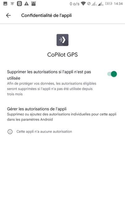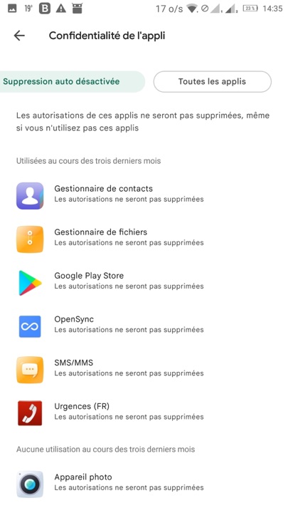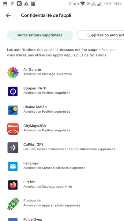 J’ai eu la surprise hier, en effectuant la mise à jour d’applications, de constater que certaines autorisations ont été supprimées pour celles d’entre elles que je n’avais pas utilisées depuis trois mois, afin, selon Google, de « protéger ma vie privée »… (image1). La liste des applications concernées s’affichent… (image 2) les détails pour chacune peuvent être consultés (image 3).