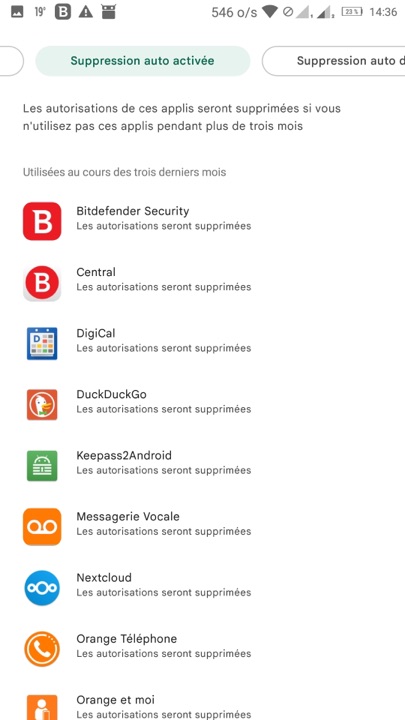 Sans que l’utilisateur n’ait eu son mot à dire, certaines apps relèvent de la catégorie Suppression auto activée, dont l’antivirus Bitdefender, les navigateurs DuckDuckGo et Firefox, le gestionnaire de mots de passe open source Keepass2, les applications d’Orange, le nuage open source Nextcloud, le client mail open source FairMail, OpenVPN Connect, l’application de messagerie Signal… D’autres apps se trouvent dans la catégorie Suppression auto désactivée dont les apps Google telles que le gestionnaire de contacts, le gestionnaire de fichiers, Google Play Store, l’application SMS/MMS…