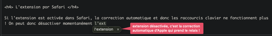 L’extension Safari est intéressante, mais dommage qu’elle désactive la correction automatique d’Apple et les raccourcis clavier. Je la trouve en revanche bien utile pour les applications tierces, avec lesquelles les raccourcis clavier et la correction orthographique ne fonctionnent pas, comme Thunderbird par exemple, mais moins efficace avec NeoOffice.