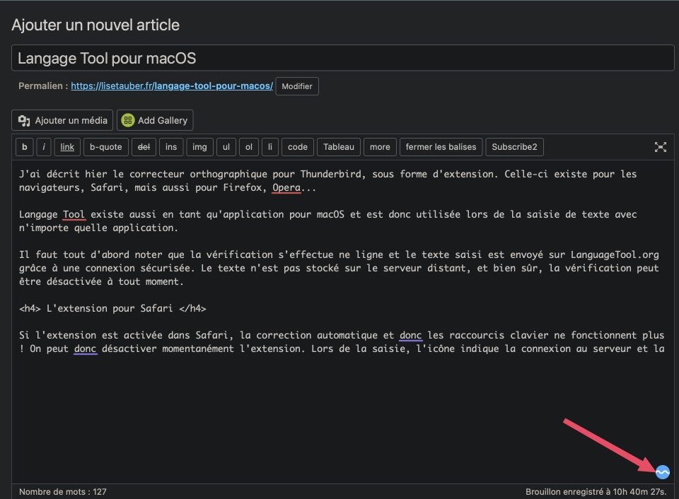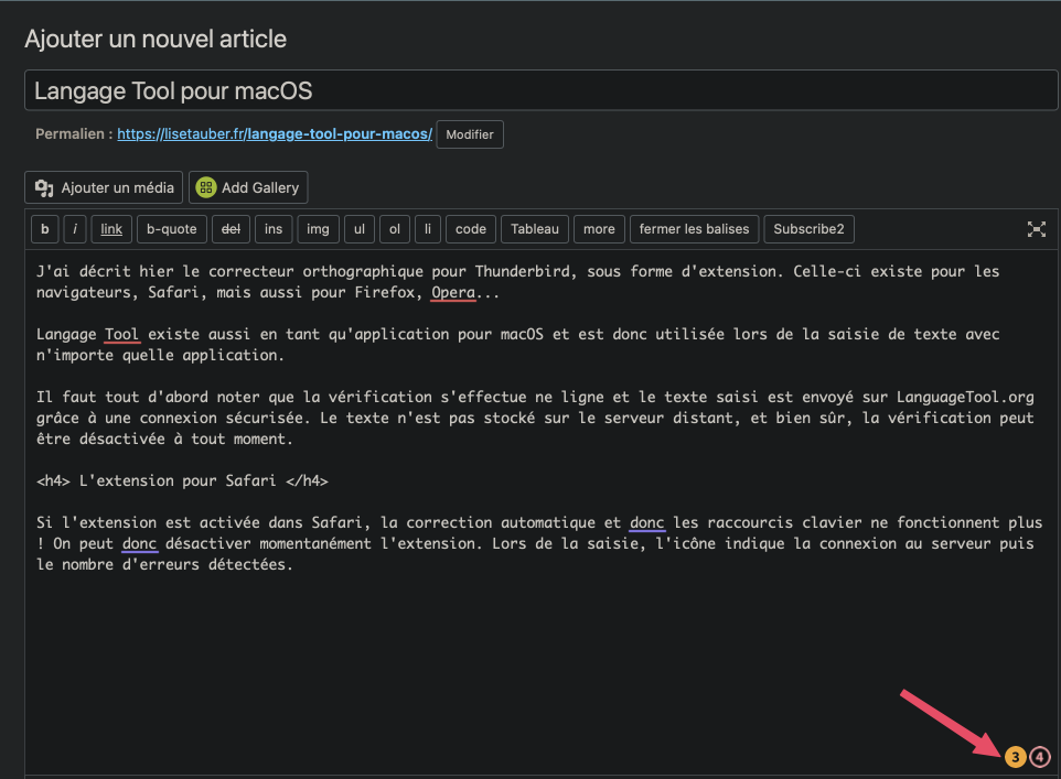 Si l’extension est activée dans Safari, la correction automatique et donc les raccourcis clavier ne fonctionnent plus ! On peut alors la désactiver momentanément si besoin. Lors de la saisie, une icône en bas de la fenêtre indique la connexion au serveur puis le nombre d’erreurs détectées.