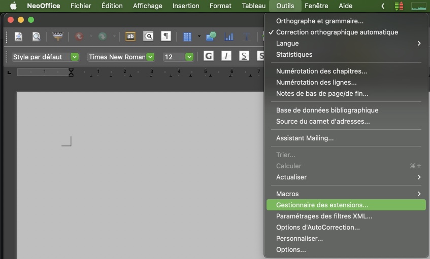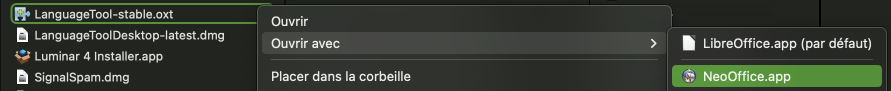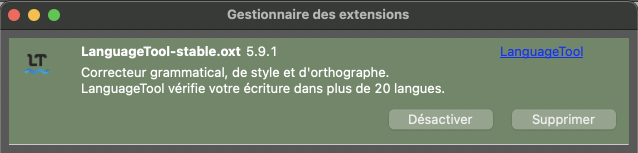 Pour installer l’extension Libre Office pour NeoOffice, cliquer sur Outils > Gestionnaire des extensions, puis sur le lien : Obtenir des extensions supplémentaires en ligne… ? ; sélectionner Language Tool puis télécharger directement l’extension depuis ce lien. Pour ajouter une extension à NeoOffice, il est nécessaire d’installer le JDK Java 17, disponible à cette adresse.