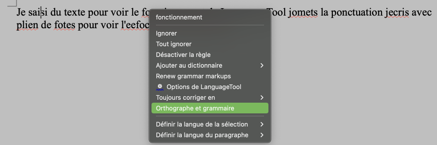 Un clic droit sur un mot indiqué en erreur affiche plusieurs options. Sélectionner « Orthographe et grammaire » corrige l’essentiel des fautes, mais en laisse passer quelques-unes ; l’extension est moins précise que celle de Thunderbird ou Safari.