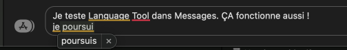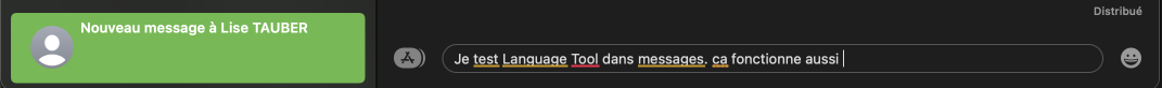 Language Tool prend en charge Mail, Messages et Notes. Je l’ai testée avec Notes, dont je ne me sers jamais… et Messages. Language Tool doit fonctionner en arrière-plan, pour que les fautes puissent être détectées. Et contrairement à Safari, les raccourcis clavier et la correction automatique sont fonctionnels !