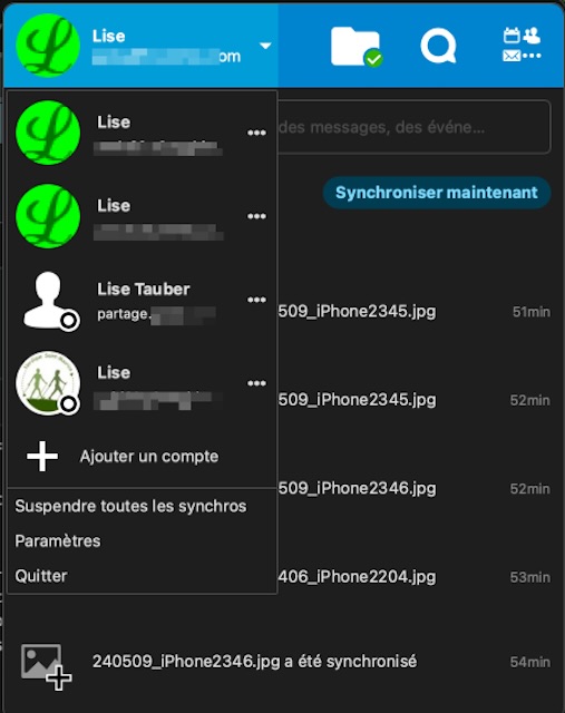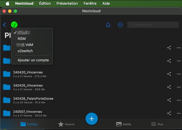 Sur chacun de mes appareils, ordinateur, téléphone, tablette, je dispose de l’application NextCloud afin de synchroniser mes données via mon nuage personnel, indépendant donc des plateformes Apple avec iCloud, Google, etc. Ayant également plusieurs comptes NextCloud, je peux les gérer depuis chacun des appareils, et mes fichiers, quel que soit le nuage sur lequel ils se trouvent, sont synchronisés sur toutes mes machines.