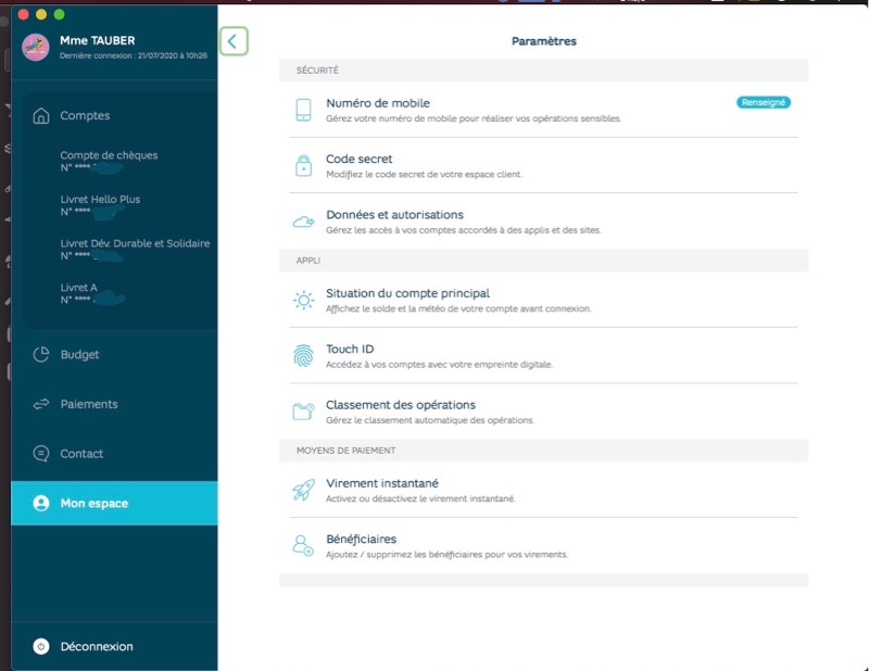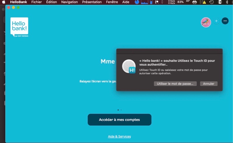 J’ai donc installé ce matin l’app pour Mac, qui est semblable à celle de l’iPad. Si on dispose d’un MacBook avec TouchBar, on peut même déverrouiller l’app avec Touch ID. Et l’on peut effectuer toutes ses opérations bancaires depuis l’app !