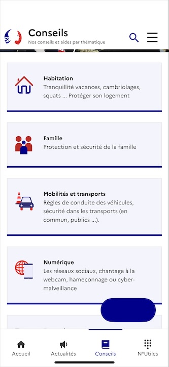 On y trouve aussi des conseils en matière d’habitation, de protection de la famille, de règles de conduite, de protection sur Internet, d’aide aux victimes, de démarches administratives. et bien sûr les numéros d’urgence ! ainsi que les pharmacies de garde de certains départements d’Île-de-France, cette option étant en phase d’expérimentation. On accède en outre à un certain nombre de démarches, telles que l’inscription à l’Opération Tranquillité Vacances (OTV) ou le vote par procuration.