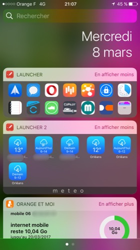 L’application Orange et moi, qui permet de suivre sa consommation fixe, SMS, Internet mobile en France et à l’étranger, gérer ses contrats et factures, souscrire une option, contacter le service client… a été mise à jour la semaine dernière. Elle dispose maintenant d’un widget, qui d’emblée affiche sa consommation de data. C’est une fonctionnalité évidemment très pratique, qui permet de suivre d’un coup d’œil où l’on est !