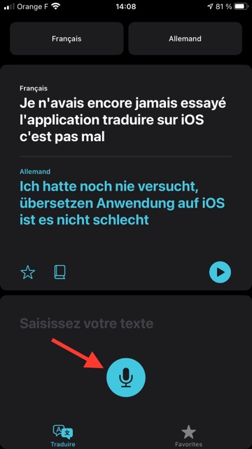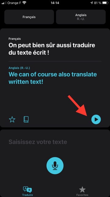 Avec Traduire, on peut bien évidemment saisir du texte écrit, en obtenir la traduction immédiate, et écouter cette dernière en effectuant un tap sur la flèche.