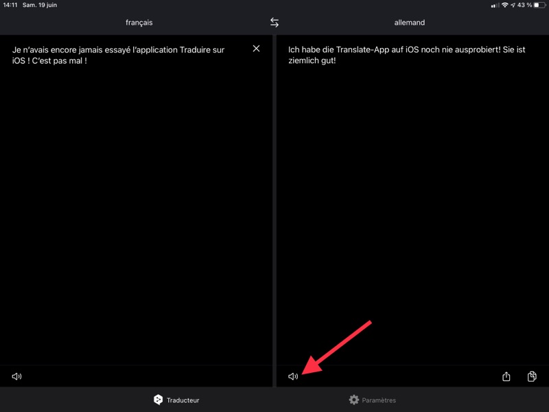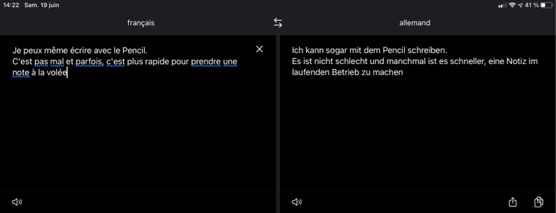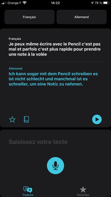 L’application Traduire permet, avec un tap sur l’icône du micro, d’obtenir la traduction immédiate orale et écrite d’une phrase, traduction que l’on peut réécouter avec un tap sur la flèche. On peut aussi, avec DeepL, écouter les textes saisis et traduits. Quelle que soit la langue (français, anglais, allemand), le texte parlé de Traduire me semble plus naturel que celui de DeepL, l’intonation est même respectée !