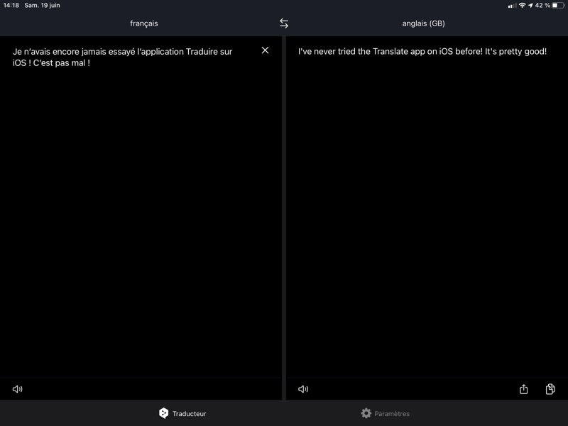 J’ai effectué quelques tests avec l’application Traduire sur iOS, que j’ai comparée à DeepL sur l’iPad (qui existe aussi pour iPhone et qui est gratuite), dans les deux langues étrangères que je maîtrise, l’anglais et l’allemand.