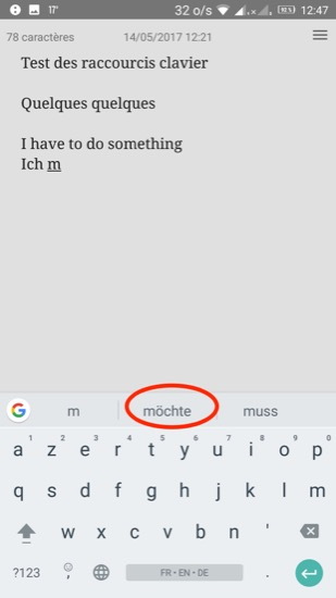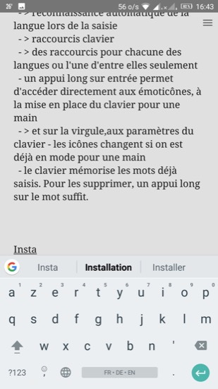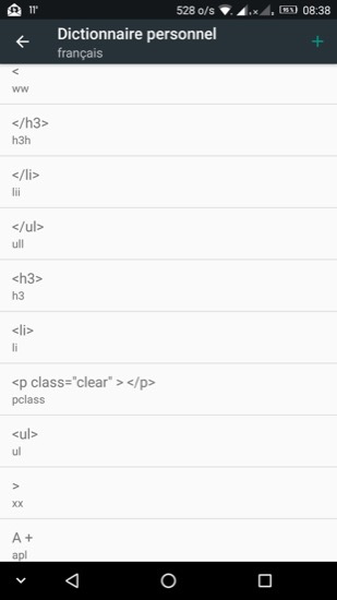 Pour chaque langue, ou de façon globale, on peut créer ses propres raccourcis. Si lors d’une faute de frappe, les mots sont automatiquement corrigés, pour qu’un raccourci soit pris en compte, il faut effectuer un tap sur celui-ci (images 7 à 10).
