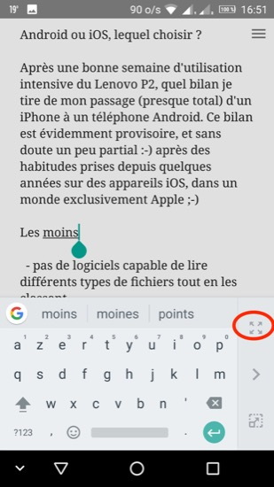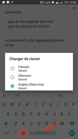 Le Lenovo P2 étant doté d’un bouton haptique, chaque frappe sur le clavier provoque une légère vibration. On sait ainsi que la saisie est bien enregistrée. Cette fonction peut être désactivée, mais je la trouve bien pratique.