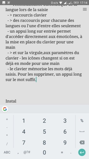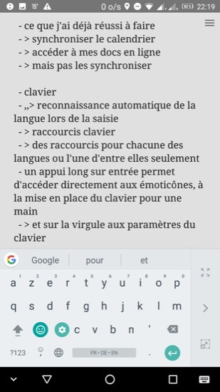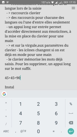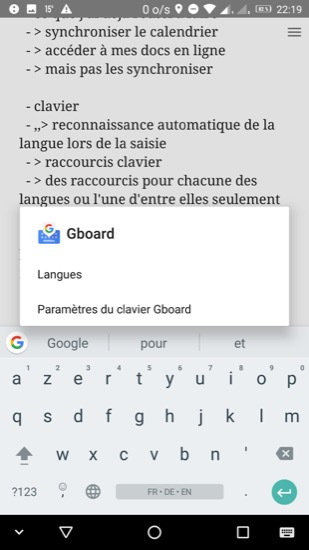 Le clavier Google offre de nombreuses options, et pour l’instant, je n’éprouve pas le besoin d’en télécharger d’autres, même si, comme pour les autres fonctionnalités, et contrairement à iOS, il est facile d’utiliser d’autres applications par défaut que celles qui sont livrées avec l’appareil.