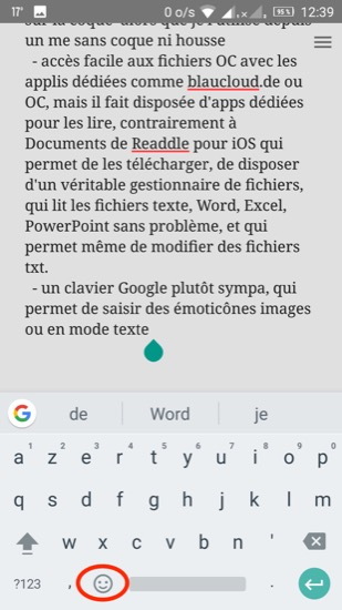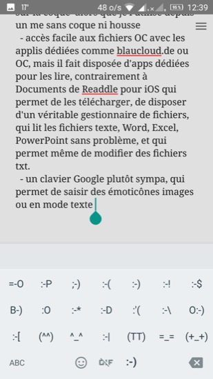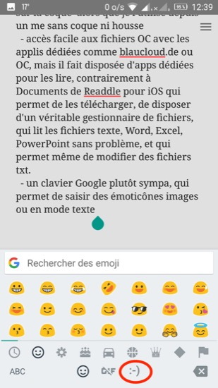 Les émoticônes sont accessibles de façon classique avec un tap sur l’icône dédiée. En effectuant un nouveau tap sur la touche « ; – ) », on affiche les émoticônes au format texte.