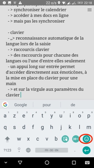 On peut également accéder aux émoticônes depuis un appui prolongé sur la virgule ou sur la touche Entrée.