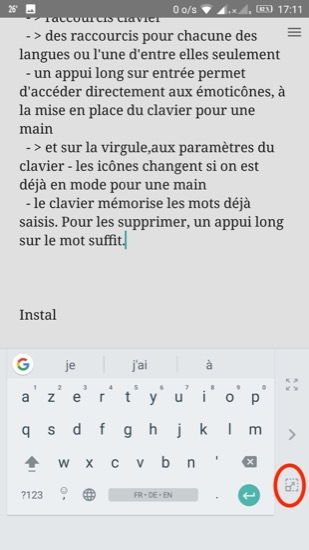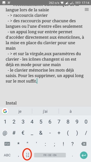 Un appui long sur la virgule affiche des choix supplémentaire, comme celui de basculer vers un clavier réduit, utilisable d’une seule main. Un tap sur l’icône d’agrandissement redonne au clavier sa taille originale. Ce même appui prolongé sur la virgule permet d’accéder aux paramètres du clavier.