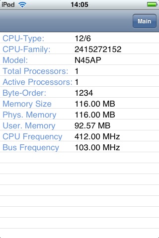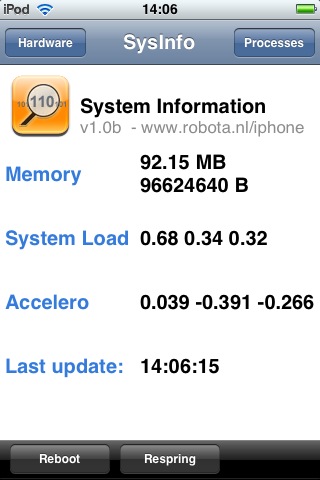 SysInfo comprend, en outre, un bouton « Reboot » qui déclenche, de façon automatique, le redémarrage de la machine, – non la mise en veille, que l’on commande en pressant le bouton « Power », mais le vrai redémarrage, celui que l’on obtient manuellement en maintenant la pression sur le bouton « Power », puis en faisant glisser son doigt sur la bande « Arrêter la machine », puis en pressant de nouveau le bouton « Power ».