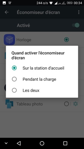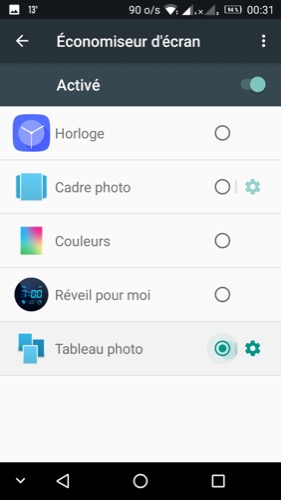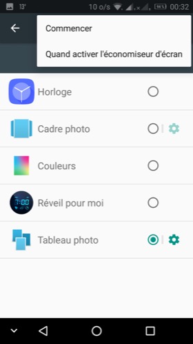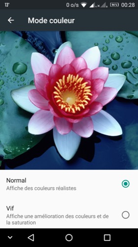 On peut choisir le mode d’affichage, normal, qui respecte davantage les couleurs réelles (tirant plus vers l’orange), et le mode vif, un peu plus bleuté, et activer un économiseur d’écran.